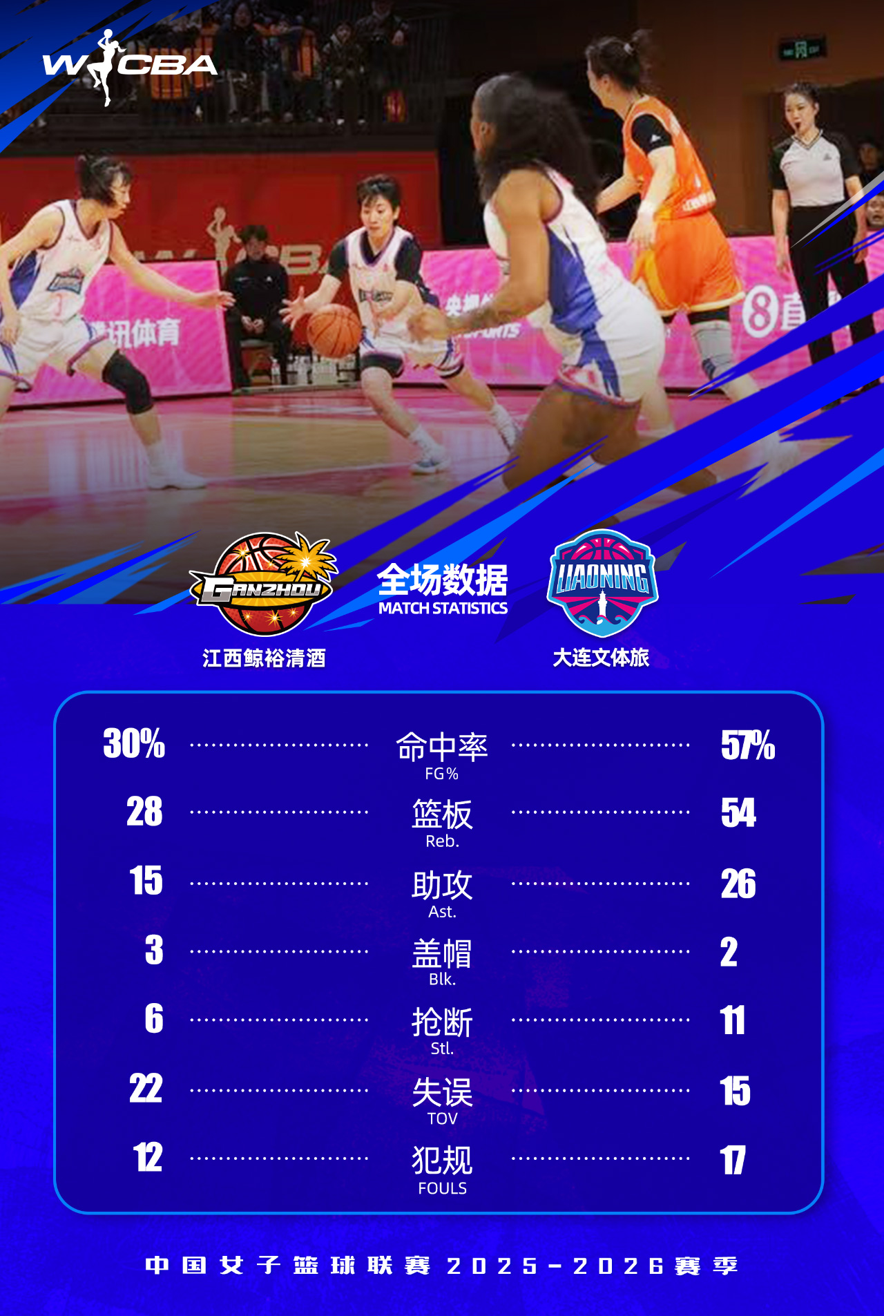 北京時間2025年12月8日19時30分,2025-2026賽季WCBA常規(guī)賽第三輪,大連文體旅女籃客場對陣江西鯨裕清酒女籃。全場比賽大連文體旅女籃攻防兩端表現(xiàn)穩(wěn)定,始終掌握比賽主動權,最終以111:59戰(zhàn)勝對手,收獲常規(guī)賽三連勝!