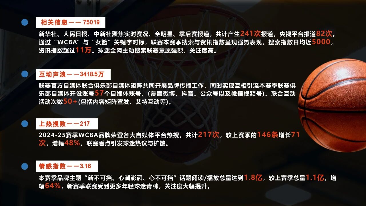 2024-2025賽季W(wǎng)CBA聯(lián)賽頻頻登上各大自媒體平臺熱搜,累計登上熱搜達217次,同比增長48%。新華社、人民日報、央視等權(quán)威媒體深度報道,聯(lián)賽搜索指數(shù)日均近5000次,資訊指數(shù)突破11萬。俱樂部在全網(wǎng)監(jiān)測數(shù)據(jù)達11,185篇,內(nèi)容覆蓋賽事宣傳、賽況追蹤、戰(zhàn)報發(fā)布等,彰顯強大傳播力與粉絲粘性。