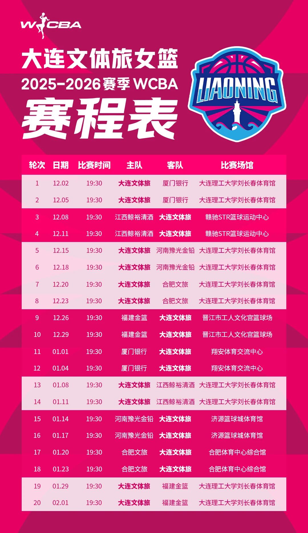 2025-2026賽季中國女子籃球聯(lián)賽(WCBA)官方賽程表已公布,大連文體旅女籃新賽季首場比賽將于2025年12月2日拉開帷幕,揭幕戰(zhàn)大連文體旅女籃坐鎮(zhèn)主場——大連理工大學劉長春體育館,迎戰(zhàn)廈門銀行。詳細賽程表見下圖,歡迎廣大球迷朋友們收藏。