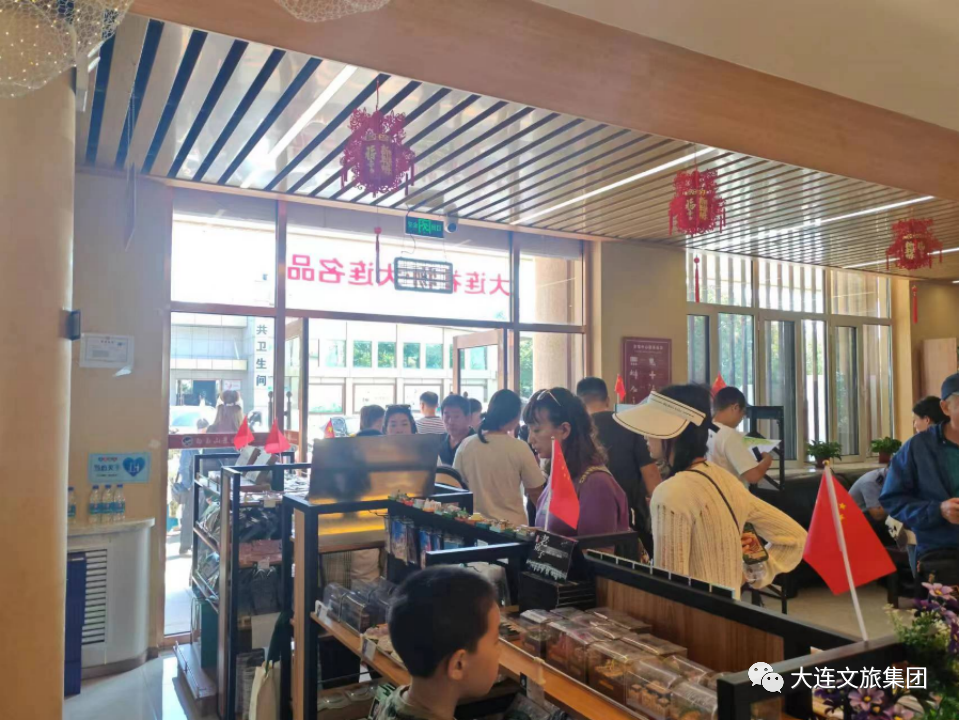 門店內(nèi)各種獨(dú)具特色的大連文創(chuàng)商品及地域特色食品深受游客們的喜愛,引得游客們的駐足、欣賞和購買。