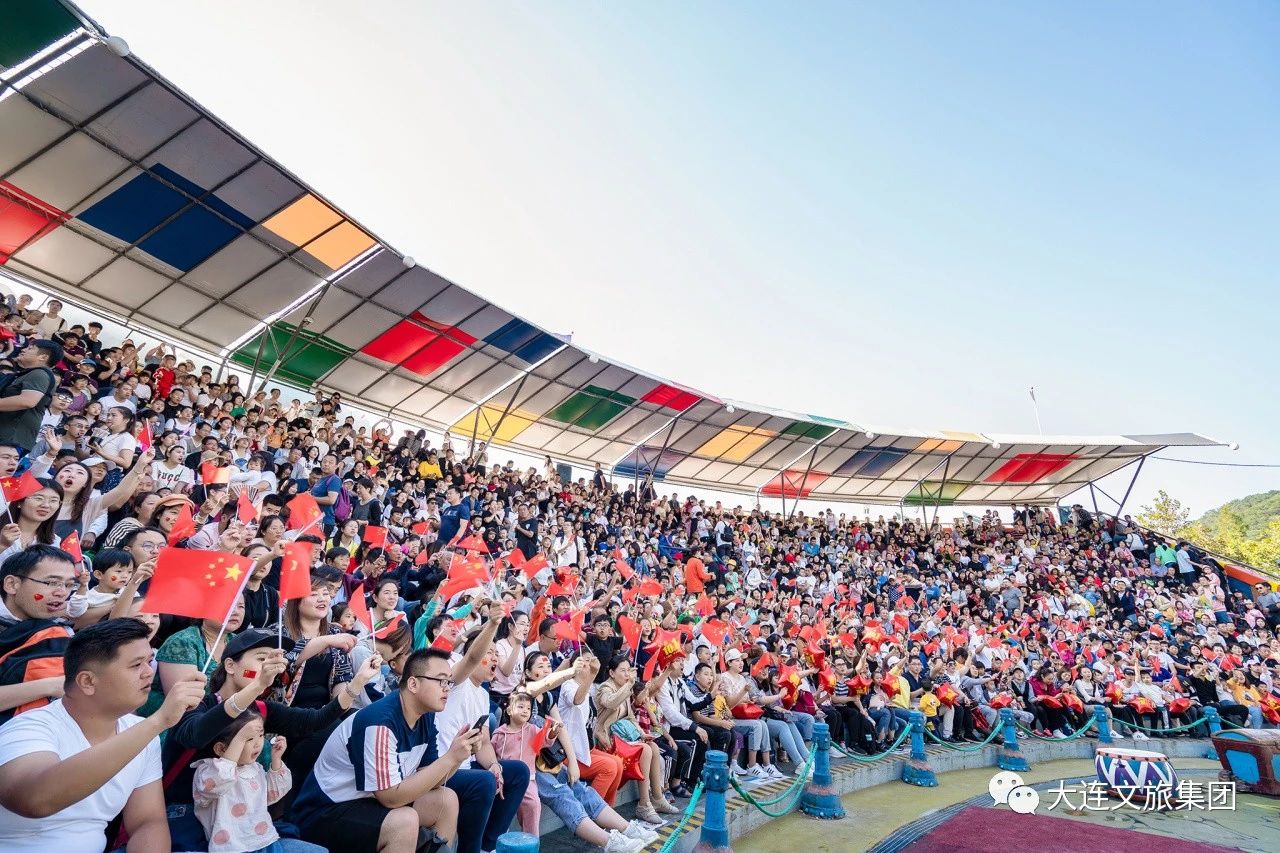 國慶當(dāng)天,老虎灘極地館在鯨豚表演場為祖國獻(xiàn)上慶生盛典,眾多身著少數(shù)民族經(jīng)典服飾的表演者也加入其中。一瞬間,將現(xiàn)場的氣氛燃到頂點(diǎn)。揮舞的五星紅旗,嘹亮的《愛我中華》,閃耀的千人熒光海祝福偉大祖國生日快樂。藍(lán)灣碼頭處,兩名水上飛人特技演員在海上升起一面巨幅的五星紅旗,水龍?jiān)诤C嫔霞て饘訉永嘶?,寓意著祖國揚(yáng)帆遠(yuǎn)航,繁榮昌盛。